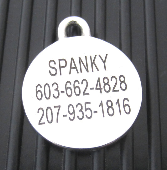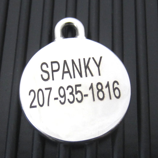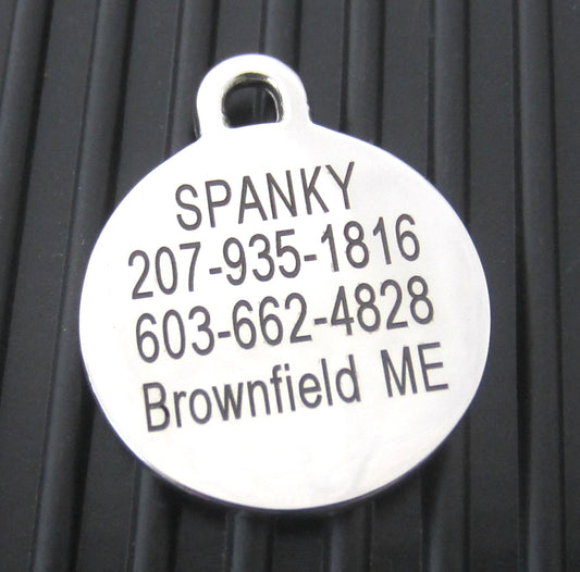 Our medium dog stainless steel ID tags are proudly made in the USA. These tags provide superior durability and a sleek appearance, making them ideal for dogs weighing 15 to 85 pounds. For dogs under 15 pounds, these tags may be too heavy, so we recommend ordering a small dog tag instead.